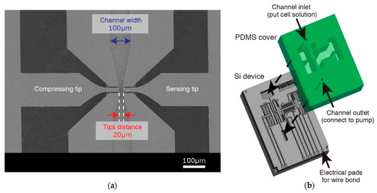 - Baëtens, T.; Perret, G.; Takayama, Y.; Kumemura, M.; Jalabert, L.; Meignan, S.; Lagadec, C.; Fujita, H.; Collard, D.; Tarhan, M.C. A practical single cell analysis method for mechanical characterization of cancer cells. In Proceedings of the IEEE 30th International Conference on Micro Electro Mechanical Systems, Las Vegas, NV, USA, 22–26 January 2017; pp. 608–611. [Google Scholar]