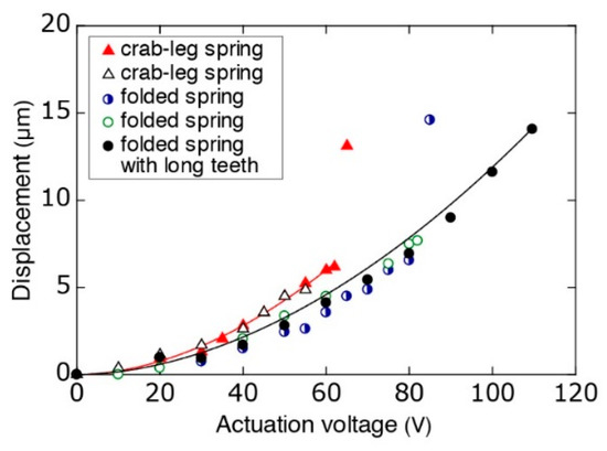 The compressing side consists of electrostatic comb-drive actuators, which provide the necessary motion of the compressing tip. Depending on the dimension of the targeted cells, the displacement requirement for the actuator varies. Therefore, we use various designs with different spring geometry, spring constant, and actuator teeth dimensions. Two different spring designs are used: crab-leg springs [26] and folded springs [27]. The folded spring design with a spring constant of 40 N·m−1 provides highly stable characteristics in terms of y-axis displacement. Conversely, the crab-leg spring design (30 N·m−1) is softer than the folded spring design, which allows longer displacement at lower actuation voltages (Figure 3). A wider displacement range is more suitable for use with cells with highly variable diameters.