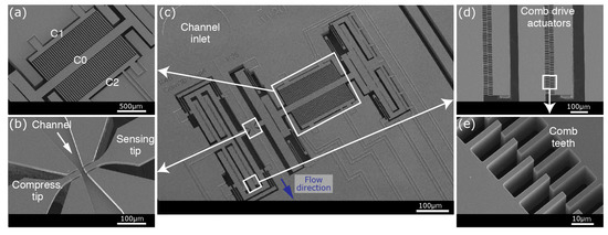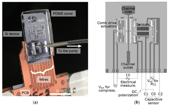 The PDMS top cover is fabricated using a standard soft-lithography process. SU8-2015 (with a height of 10 µm, MicroChem, Westborough, MA) is patterned on a silicon wafer and used as a mold for PDMS. Then, the channel inlet and outlet are opened using biopsy punchers (1 mm for the inlet and 0.5 mm for the outlet). Finally, the PDMS cover is aligned and assembled on the MEMS device to form the channel (Figure 2b).