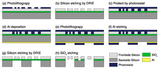 Fabrication process of the device. (a) Frontside photolithography, (b) Frontside silicon etching, (c) Protecting frontside structures, (d) Backside Al deposition, (e) Backside photolithography, (f) Al etching, (g) Backside silicon etching, (h) SiO2 removal.