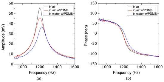 To characterize the behavior of the device during harmonic analysis, the frequency response of the system was monitored with the lock-in-amplifier (Figure 8). Compared to the initial device characteristics (resonance frequency of 1195 Hz with a quality factor (Q-factor) of 8.9), the assembled device (with PDMS cover) showed a slight increase in the resonance frequency (1200 Hz) and a decrease in the Q-factor (6.3) due to the increased damping as a result of the PDMS slab. Filling the channel with liquid also changes the frequency response. Although the effect of the liquid in terms of mass is negligible compared to the total mass of the mobile part of the sensing arm, the surface tension due to the air-liquid interface in the handling region did affect the spring constant of the system. As a result, the resonance frequency was increased to 1220 Hz with a similar Q-factor (6.8).