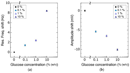 Increasing glucose concentration resulted in an increase of the resonance frequency (Figure 9). Taking the water measurements as the base value, we obtained a resonance frequency shift of 1.4 Hz, 2.4 Hz, and 8.3 Hz for glucose concentrations of 0.1%, 1% and 10%, respectively (Figure 9a) with stable characteristics (Figure S3). Similarly, a decrease in amplitude is observed with increasing glucose concentration (Figure 9b, Figure S4). Compared to the initial water measurements, a decrease of 5 mV, 7 mV, and 10 mV in the amplitude was observed due to higher damping. These measurements show that the proposed device is capable of observing changes in the mechanical characteristics at the handling area.