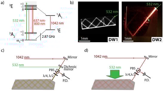 - Acosta, V.M.; Bauch, E.; Jarmola, A.; Zipp, L.J.; Ledbetter, M.P.; Budker, D. Broadband magnetometry by infrared-absorption detection of nitrogen-vacancy ensembles in diamond. Appl. Phys. Lett. 2010, 97, 174104. [Google Scholar] [CrossRef]