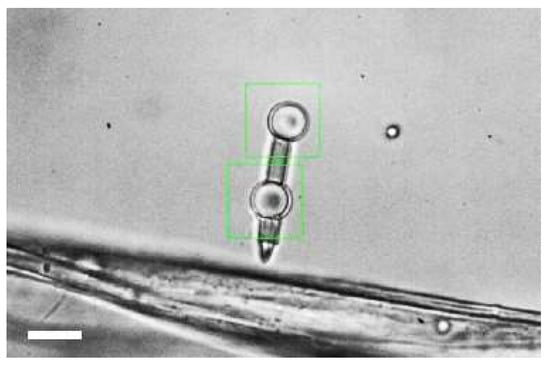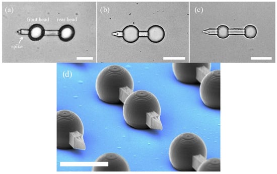 A micro-dumbbell consists of two spherical beads with a bar between them and a spike on one end (Figure 2). In Figure 2a–c three different designs of the micro-tool are presented. They vary in the size of the bead, the overall proportions and the total length. All three types proved to work well, which indicates that the size of the tool can be adjusted to specific needs, with the limits imposed by the fabrication technology. The beads are trapped with optical trapping beams, one for each bead. Both traps have the same stiffness and the two beams are focused at the same depth in the specimen. By moving both traps simultaneously, the tool can be moved around and rotated in 3D space. Once trapped, the tool aligns itself in the horizontal position (i.e., parallel to the coverslips) and floats horizontally even in the absence of optical traps. That means that the trapping process is easy and keeping the tool in horizontal position requires no additional forces.