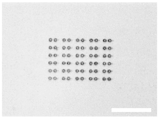 Optical microscope photograph of an array of 30 micro-tools printed on a glass substrate (microscope coverslip). Printing the entire matrix of micro-tools makes it easier to locate the tools on the glass slide after they are detached and float in a water-filled chamber. Scale bar: 100 µm.