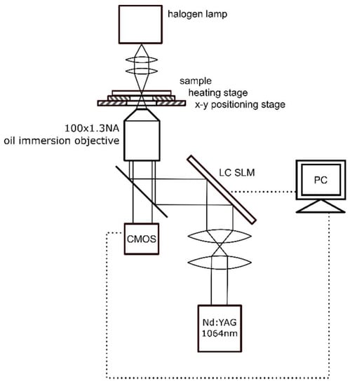 The holographic optical tweezers setup [14] is schematically presented in Figure 4. It is based on the inverted microscope (Olympus IX71) and the Nd:YAG laser (1064 nm, 4 W, CW, Laser Quantum) as a trapping source. The laser beam is collimated and illuminates an SLM matrix (Spatial Light Modulator, HoloEye-Pluto). After reflection from the SLM, the beam is tightly focused with a high-numerical aperture oil-immersion objective (100×, NA = 1.3, Olympus UPlanFL). The SLM acts as a dynamic, programmable diffraction grating and generates two optical traps in a sample plane—one for each bead of the micro-tool. A heating stage maintains the sample temperature, in particular during the viscosity measurements. The microscope image is recorded with a CMOS camera (Mikrotron Inspecta) working in a high-speed mode and the location of the traps as well as the position of the trapped beads is registered and analyzed. The displacement between the trapped bead and the trap centers (Δs in Figure 5) is a measure of the external force acting upon the bead, and can be used to determine, for example, the resistance of the medium.