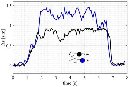 The first experiment looked into the dependence of the drag on the micro-tool motion direction. The displacements from the trap centers (Δs) of both beads were recorded for the ‘forward’ (probing spike in the front) and ‘backward’ (spike at the back) directions (Figure 6). The results show that the drag force exerted on the front bead increased more than twice in the second case. The streamlined shape of the dumbbell is effective in reducing the resistance of motion. One can conclude that adding a small spike in front of the bead (see Figure 2) remarkably reduces the drag forces.