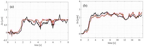 Fluid viscosities can be compared by measuring the trapping beam-bead displacement in an accelerating tool. The displacements of the front (black) and rear (red) beads for the tool moving in water (a) and the 30% glycerol solution (b). At the beginning, the velocity increases (first 2 and 3 s, respectively) and then remains constant.