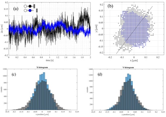 Vibrations measurements in microscale. (a) Displacement of the front bead for the trapped micro-tool in contact (black) and not in contact (blue) with the cotton fiber. The two measurements were performed in different two-second intervals and are presented on the same plot for comparison; (b) corresponding position of the front bead in the x-y plane (the sample plane) measured every 0.2 ms. The alignment of the micro-dumbbell in the x-y plane corresponds to the one in Figure 8. A solid black line indicates the direction along which histograms in (c,d) were calculated; (c,d) histograms of the x and y positions of the bead along the line from (b). Blue bins correspond to blue points, gray bins to black points and the dark grey color is the overlapping region.
