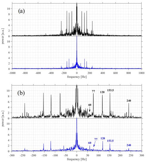 Fourier spectra of the two signals shown in Figure 8a, corresponding to the ‘contact’ (black) and ‘no contact’ (blue) cases. Main frequency peaks in the black plot are at 77, 120, 153.5, 240, 480 Hz. Main frequency peaks in the blue plot are at 60, 120, 153.5, 240 Hz. Sampling frequency was 5000 Hz, we show only the range of ±1000 Hz in (a) and ±300 Hz in (b) for clarity.