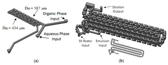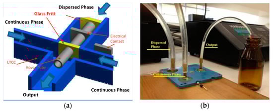 Microfluidics continuous flow techniques display advantages when compared to batch chemical processes, such as high surface-to-volume ratio, small thermal inertia, fast temperature changes, easy adjustment of residence times, and production of emulsions and suspensions with monodisperse distribution [1,2]. Microfluidic devices have been used in many applications in pharmaceutical, biotechnological, and chemical industries such as fine chemical synthesis, crystallization, and combinatorial synthesis [3,4,5].