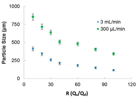 In Figure 3, the relation of particle sizes versus the ratio between the phases for two applied total fluid flow rates is presented. The 3D-FFD device presented smaller particles in higher continuous phase flow rate (3 mL/min). In this case, particles ranging from 400 µm to 115 µm with polydispersity index less than 1.5% (PDI = (σ/d)2) were obtained. Polydispersity index (PDI) is defined as the square of the standard deviation/mean diameter. It was observed that when flow ratio between the phases is increased, particle size became smaller. This behavior is expected for most microfluidic devices applied for emulsion production. The emulsion droplets became smaller in size when the continuous flow rate is higher. During droplet formation, just small amounts of dispersed phase can reach the continuous phase [46].