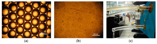 In Figure 4a is shown a monodisperse emulsion of sodium alginate droplets without gelation. Considering a continuous oil phase of 300 μL/min, it was possible to obtain droplets with 200 µm. After the ionic gelation process, it was possible to obtain sodium alginate microcapsules that are shown in Figure 4b. As the emulsification process inside the channels is fast, the droplets reach the ionic solution and solidify rapidly, forming microcapsules with some deformation of their shapes. Experimental arrangement of the microfluidic device used to produce sodium alginate microparticles is depicted in Figure 4c.
