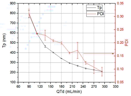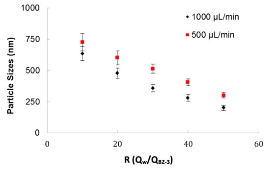 The 3D-FFD device was also used to produce particles by nanoprecipitation process. Figure 5 shows the particle size relation with ratio between fluid flows (R = Qwater/QB-3) for two water flow rates (Qwater) of 1000 µL/min and 500 µL/min. This ratio (R) indicates how many times the continuous phase flow is higher than the dispersed phase. The higher the term R is, the smaller the droplet size gets.