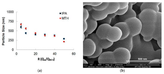 (a) Benzophenone-3 particle size as a function of the ratio between phases for two different solvents (isopropyl alcohol and methanol), (b) SEM-FEG micrograph obtained with a flow rate of 500 µL/min and BZ-3 concentration of 7.5 mg/mL, yielding mean particle size of 250 nm.