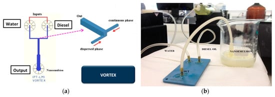 A vortex micromixer was used to produce a water-in-diesel emulsion [47,48]. The introduction of water in diesel fuel, as an emulsion, is one of the attempts to reduce the emission of pollutants [49,50]. Usually, some commercial water-in-diesel emulsions contain droplets with sizes from 3 to 10 µm. Water-in-diesel emulsions present advantages such as reduced motor power consumption and lower temperature. The presence of water nanodroplets in diesel causes micro explosions in the combustion process. This microexplosions increase the presence of oxygen, resulting in an enhanced fuel performance. It was also demonstrated that small amounts of water nanodroplets (5 to 14%) could reduce the NO, NOx, and CO2 emission in a range of 18% [10,51,52,53,54]. The micromixers are helpful to obtain emulsions in a continuous way and are presented as a tool to produce water-in-diesel emulsion inside an engine. Vortex geometry has been used for intensifying mixtures by promoting vortices between fluids, and it was applied to produce a simple emulsion. We analyzed the influence on the sizes of water particles by changing parameters, such as surfactant concentration and total flow rate, maintaining the ratio between water and diesel phases.