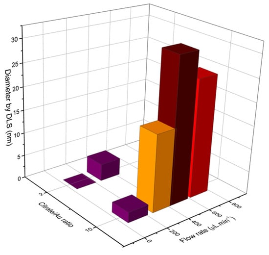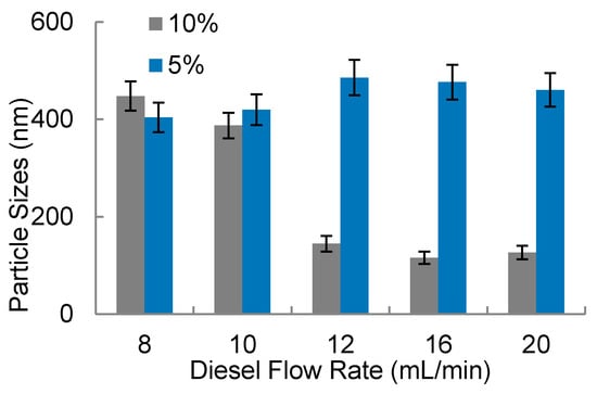As considered before on the 3D-FFD, the water droplets’ sizes were evaluated observing the influence of flow rates. In Figure 8 the water droplets’ sizes (in nanometers), in a function of diesel flow rate, is shown.