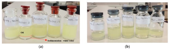 It was observed in Figure 8 that the smallest amounts of surfactant (5% v/v) present droplets with higher sizes compared to the experiments that used 10% surfactant. Additionally, with 5% of surfactant, water droplets present sizes between 400 nm up to 600 nm with poor stability, presenting a milky aspect, promoting phase separation after some minutes. In higher flow rates combined with higher surfactant concentration (10%), it was possible to note water droplets with smaller sizes, in a range below 200 nm. The diesel flow rate with this surfactant condition (10% v/v) presents more influence in the water particle sizes. In Figure 9a final solutions obtained with 5% of surfactant are shown. In this picture, it is possible to observe a white region which indicates a phase separation. This indicates that water nanodroplets coalesced and separated from the oil. The white sediment is the surfactant with water. In Figure 9b, upon inspection, it can be seen that the solution is translucent and homogeneous. Usually the homogeneity of color solution indicates more stability. The particle size measurements were also helpful to analyze the solution stability.