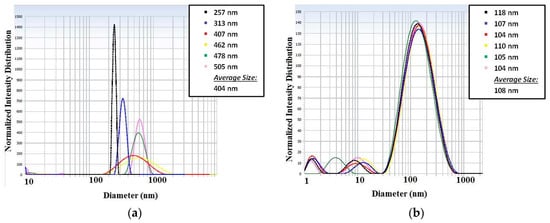 Particle sizes measurements: (a) results obtained for a solution with 5% of surfactant and (b) results obtained for a solution with 10% of surfactant.