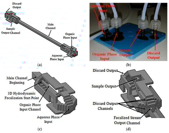 3D hydrodynamic organic phase focalization along the main channel is assured thanks to the projected input channels configuration [58], Figure 11c. The main channel was designed with a length of 21.4 mm and a hydraulic diameter of 772 µm. The projected output channels configuration is similar to that used at the input stage, Figure 11d. The main difference lies in shorter discard output channels and sample output channel hydraulic diameter. The focalized stream output channel is centered relative to the main channel cross section and was projected with a hydraulic diameter of 214.63 µm.