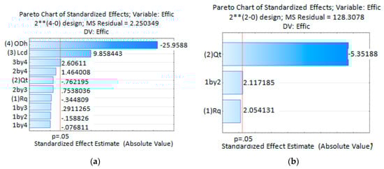 Statistical analysis results, Pareto Chart of Standardized Effects for the extraction efficiency (a) For simulation experiences; (b) For experiments done with microfluidic device with ODH = 214.63 µm and LCD = 21.4 mm.