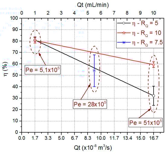 The study was conducted in two stages. First, simulations for device microfluidics and chemical transport analysis, using COMSOL® Multiphysics (COMSOL 4.2, COMSOL Inc., Stockholm, Sweden), were done with five device configurations. In the second stage, experiments were done with the device which showed better simulation results. The extraction efficiency was the variable used as an indicator for device performance validation. A factorial experimental planning with the central point [61] was used to access the effect of process variables on the extraction efficiency. For simulations, those variables were flow rate ratio (RQ), total flow rate (QT), main channel length (LCD), and focalized stream channel output hydraulic diameter (ODH). By its time, physical experiments used RQ and QT as process variables. Experiments were conducted in triplicate for statistical analysis. Statistica13® software (StatSoft Inc., Tulsa, OK, USA) was used for analyzing simulation and experimental results. Used software calculates automatically the Pareto chart and the predicted extraction efficiency mean value. Table 3 summarizes the variables values and conditions used.