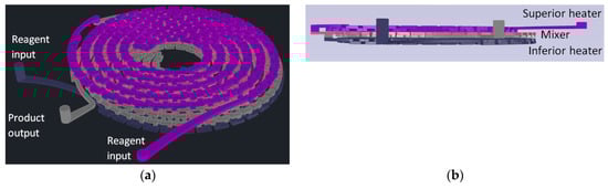 Microfluidic reactors can be fabricated in different materials such as polymers, glasses, silicon, metals, and ceramics, using several techniques [12]. Low temperature co-fired ceramics (LTCC) green tape ceramic substrates present interesting advantages such as the possibility of microfabricating 3D geometries and can be used for higher flow rates. LTCC material is chemically inert to most solvents, it has a hydrophilic surface behavior [13], presents a low thermal coefficient of expansion, can hold out high operational temperatures, and can withstand high internal pressures, allowing implementation of several chemical process with applications in stringent environments [14,15,16]. Applications of LTCC microfluidic devices to carry out several chemical process operations are reported in the literature, including bioreactors [17,18,19], enzymatic reactors [20], combustors [21,22], microthrusters [23], mixers [24,25], chemical reactors [26,27], heat exchangers [28], and gold nanoparticles generators [29].