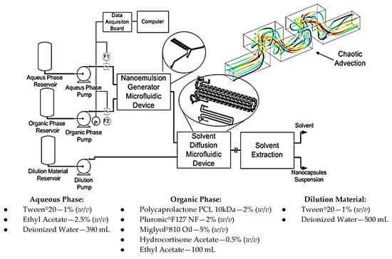 H.C.G. designed microfluidic devices related to the solvent extraction process, performed experiments to determine the device behavior, and analyzed the experimental results; to synthesis and functionalization of gold nanoparticles and analyzed experimental data; and designed the microfluidic devices for miniaturizing the emulsification–diffusion and solvent extraction/evaporation chemical process, performed and analyzed the experiments needed for microfluidic process operationalization, and helped in the project of the prototype for Nanocapsules production. R.M.C. designed microfluidic devices related to synthesis and functionalization of gold nanoparticles, manufacture such devices, performed experiments, chemical analysis and analyzed experimental data. J.d.N.S. designed microfluidic devices related to production of sodium alginate microparticles and benzophenone-3 synthesis and perform all experimental analysis; also conducted the experiments related to water-in-diesel nanoemulsion in vortex devices, performing the devices microfabrication, measurements and experimental analysis. A.M.d.O. contributed with reagents and materials and analyzed some experimental data. M.R.G.-R. led the research, supervised the design and fabrication of all the microfluidic devices for chemical process miniaturization reviewed in the present work, analyzed and discussed experimental work, conducted the project of the prototype for Nanocapsules production and made the final revision of the paper.