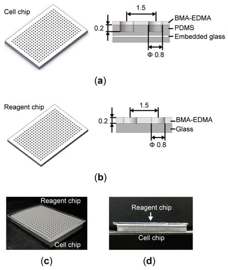 The high-throughput superhydrophobic cell culture system consists of a pair of microwell array chips—a cell chip and a reagent chip. As shown in Figure 1a, the cell chip is made of a microfabricated polydimethylsiloxane (PDMS) microwell array containing 384 wells (800 μm diameter, 200 μm deep, and 700 μm pitch). A ~100-μm-thick superhydrophobic polymer layer (poly(butyl methacrylate-co-ethylene dimethacrylate); BMA-EDMA), which serves as a physical barrier to the culture medium, is synthesized and attached to the top surface of the PDMS microwell array by following the fabrication protocol published previously [,]. The corresponding reagent chip shown in Figure 1b is fabricated by attaching a 200-μm-thick layer of BMA-EDMA polymers with 800-μm-diameter holes on a piece of glass. The detailed fabrication protocol can be found in our previous study []. Prior to use, both the cell and the reagent chips were soaked in 75% ethanol for 15 min, followed by exposure to Ultraviolet (UV) light for 2 h. As demonstrated in Figure 1c, when these two chips are aligned and pressed together face-to-face, each reagent microwell contacts with the corresponding cell microwell to enable the reagent exchange by diffusion.