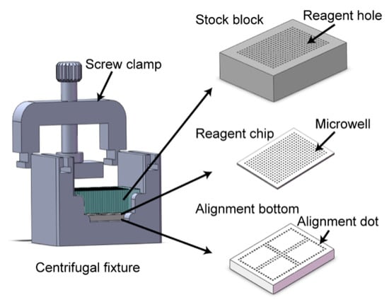 Schematic of the nanoliter centrifugal liquid dispenser (NanoCLD). Assembly of the NanoCLD consisting of four parts: a stock block, a reagent chip, an alignment bottom, and a centrifugal fixture. A screw clamp was employed to hold these parts together in the fixture during centrifugation.