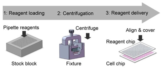 Operating procedure of the NanoCLD. First, reagents were pipetted from 96-plates to the stock block using an adjustable tip spacing pipette. Second, the reagents were dispensed into the reagent chip in the fixture under the centrifugal force. Third, the dispensed reagents were further delivered to cells by aligning and covering the reagent chip upside down onto a cell chip.