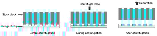 Liquid dispensing by centrifugation. Before centrifugation, the reagents are retained within the reagent holes of the stock block due to the capillary action. During centrifugation, the reagents are spun down into the microwells due to the centrifugal force and the excess air in the microwells is expelled out. After centrifugation, the stock block is taken out from the fixture and nanoliter-volume reagents are dispensed into the microwells.