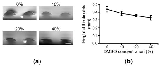The volume of dispensed liquid into the microwells is determined by four factors: (1) size of microwells of the reagent chip; (2) hydrophilic properties of the glass bottom of the reagent chip and the inner surfaces of the reagent holes; (3) surface tension of dispensed liquid; and (4) separation speed of the stock block from the reagent chip after centrifugation. In the current study, we tried to simplify the system to improve the reproducibility of liquid dispensing. Therefore, the sizes of the microwells were unchanged throughout the study so that the variation introduced by the chip fabrication was minimized. The calculated volumes of the microwells in the reagent and the cell chips were ~160 and 220 nL, respectively. The glass bottoms of the microwells and the inner surfaces of the reagent holes were left untouched to prevent the variations from any surface modification processes. The surface tension of the dispensed liquid determines how easy it is to break the liquid when the fixture is dissembled. As dimethyl sulfoxide (DMSO) is a common solvent for drug discovery applications, we employed DMSO solutions to evaluate the relationship between the surface tension and volumes of dispensed reagents. We discovered that when the DMSO concentration was over 50%, the superhydrophobic layer was destroyed, leading to cross-contamination. Therefore, we prepared a serial of binary mixtures of DMSO and water ranging from 0%, 10%, 20%, to 40% (DMSO in water, volume ratio). The surface tensions of these mixtures can be found as 71.6, 61.0, 56.0, and 52.5 mN/m at 25 °C, respectively, in the reference []. As shown in Figure 5, the dispensed volumes measured as the heights of the droplets (the measured height of the convex meniscuses plus 200 μm of the microwell height) did show a correlation with the surface tensions of the dispended mixtures, suggesting that we need to use a single solvent recipe for the entire analysis in future studies. Finally, the separation speed of the stock block from the reagent chip may also play a role in determining the size of dispensed liquid. Fortunately, due to the requirement of the alignment, the stock block was designed to be sliding-fitted into the fixture with a minimal clearance. As a result, the block can only be lifted out slowly by hand and no variation caused by this manual operation was observed (data not shown).