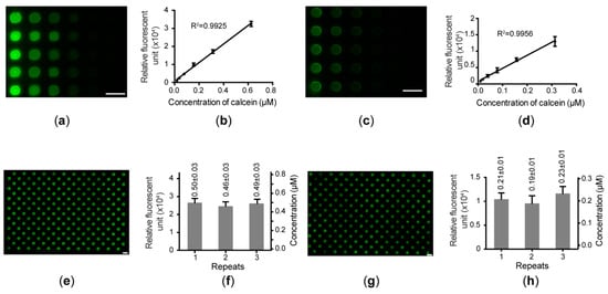 The quantitative delivery of reagents into individual microwells across the entire chip without any cross-contamination is the prerequisite to utilizing this NanoCLD for high-throughput cell analysis. To quantitate the reagents being transferred in the dispensing process, we prepared serially diluted calcein solutions with concentrations of 0.02, 0.04, 0.08, 0.16, 0.3, and 0.6 μM. As shown in Figure 6a,b, calcein solutions were first loaded into the reagent chip with the NanoCLD, and the images of the microwells were taken under a microscope. The fluorescence intensities of the microwells showed a linear correlation with the calcein concentrations with a R2 of 0.99. Next, the reagent chip with the dispensed calcein was sandwiched to the cell chip, which was preloaded with DI water. The resulting calcein gradient in the chip assembly demonstrated a linear relationship with a R2 of 0.99 as well (Figure 6c,d). Both the linear results proved that the quantitative dispensing of reagents can be obtained with the NanoCLD.