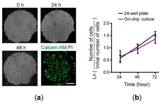 MCF-7 cells were cultured in Dulbecco’s modified Eagle’s medium (DMEM) supplemented with 10% fetal bovine serum (FBS), 100 U/mL penicillin, and 100 μg/mL streptomycin (all from Gibco, Grand Island, NY, USA) in a 37 °C incubator with a saturated humidity and 5% CO2. Cells were passaged every 2 or 3 days for fewer than 10 passages before abandonment. The detailed operation protocols for on-chip cell culture can be found in our previous study [,]. Briefly, prior to cell seeding, the cell chip was coated with Matrigel (BD Biosciences, San Jose, CA, USA) at 37 °C for 2 h. Then, cells were loaded by submerging the entire chip into 1 mL of the cell suspension solution for 15 min to allow the cells to settle, followed by the aspiration of the excess medium. After that, the cell chip was placed in covered double Petri dishes with excess sterile water for cell culture in the incubator. Culture medium was changed every 12 h to provide fresh medium and oxygen to cells. To further verify the on-chip culture, 50 ± 10 MCF-7 cells were loaded into each microwell and cultured for 3 days. Cell viability was assessed at the end of the culture by calcein AM (Invitrogen, Carlsbad, CA, USA) and propidium iodide (PI, Sigma-Aldrich, St Louis, MO, USA) double staining according to the manufacturers’ instructions. As a comparison, cells were also seeded in 24-well plates at a density of 2.5 × 104 cells/cm2 as a macroscale control. Cell numbers in 20 randomly picked microwells were counted manually at different time points, whereas the cells in 24-well plates were counted using a hemocytometer.