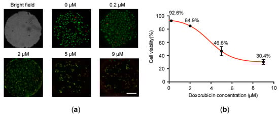 Doxorubicin-induced cell apoptosis on the chip. (a) Fluorescent micrographs of MCF-7 cells treated with different concentrations of doxorubicin and stained with calcein AM and PI (scale bar: 200 μm). (b) Calibration curve of cell viability vs. doxorubicin concentrations (n = 7).