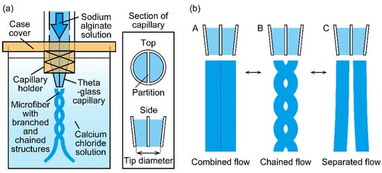 A 5-mL syringe (Terumo Corp., Tokyo, Japan) containing a sodium alginate solution was connected to the theta-glass capillary with silicone tubes (AS ONE Corporation, Osaka, Japan) and ethylene tetrafluoroethylene (ETFE) tubes (VICI Precision Sampling, Inc., Baton Rouge, LA, USA). The theta-glass capillary was vertically set to the capillary holder and case cover and then placed on a clear case filled with a calcium chloride solution (Figure 2b,c). The theta-glass capillary tip was submerged under the calcium chloride solution, and the direction of the capillary outlet was approximately aligned to the direction of gravitational force. When the sodium alginate solution was extruded into the calcium chloride solution using a syringe pump (KDS 210, KD Scientific Inc., Holliston, MA, USA) under precise control of the flow rate, calcium-alginate hydrogel microfibers were formed by a crosslinking reaction of the sodium alginate solution with calcium ions. The formation of the microfibers was observed using a high-speed microscope (VW-9000, KEYENCE Corp., Osaka, Japan) and we classified the flow regimes according to the shapes of the alginate solution streams.