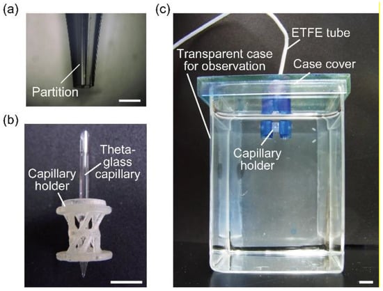 The device used to form alginate microfibers was composed of a theta-glass capillary, capillary holder, and case cover. The tip of the theta-glass capillary (TST150-6, World Precision Instruments, Sarasota, FL, USA) was sharpened with a puller (PC-10, Narishige Co., Ltd., Tokyo, Japan). To adjust the tip diameters (tolerance: ±10 µm), we cut the sharpened tip using a microforge (MF-900, Narishige Co. Ltd., Tokyo, Japan) and grinded it using a microgrinder (EG-400, Narishige Co., Ltd., Tokyo, Japan) (Figure 2a). A capillary holder and case cover for immobilizing the theta-glass capillary were fabricated using a 3D printer (AGILISTA-3100, KEYENCE Corporation, Osaka, Japan).
