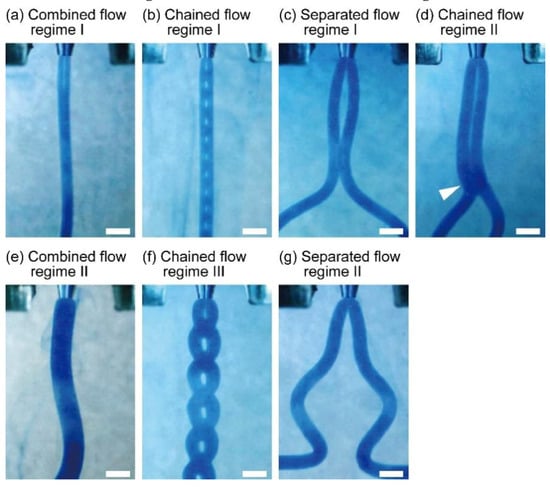Flow regimes of a sodium alginate solution extruded into a calcium chloride solution at various flow rates through a theta-glass capillary: (a) combined flow regime I (0.01 mL/min); (b) chained flow regime I (0.03 mL/min); (c) separated flow regime I (3.0 mL/min); (d) chained flow regime II (4.1 mL/min). The arrowhead shows the combined part of the flow; (e) combined flow regime II (7.0 mL/min); (f) chained flow regime III (9.0 mL/min); (g) separated flow regime II (11 mL/min). Scale bars are 1 mm.