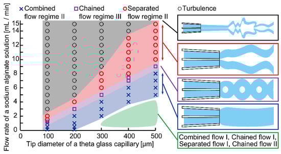 Experimental phases showing relationships between the flow regimes, flow rate of the sodium alginate solution, and tip diameter of the theta-glass capillary. Refer to Figure S1 for detailed data of the bottom-right regime.