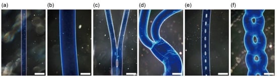 Alginate microfibers with various shapes: (a,b) single-threaded fibers formed in a combined flow regime (a) I and (b) II; (c,d) branched fibers formed in flow regimes changing from (c) combined flow regime I to separated flow regime I, and (d) combined flow regime II to separated flow regime II; (e,f) Chained fibers formed in chained flow regime (e) I and (f) II. Scale bars are 500 µm.