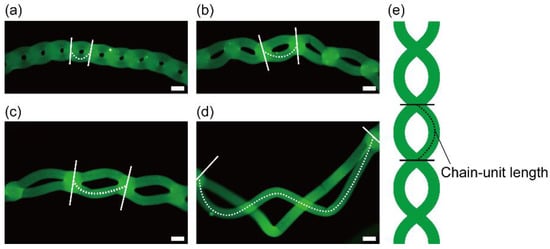 To evaluate the variability in the shape of chained alginate microfibers, we formed chained alginate microfibers by extruding 2.0% (w/w) sodium alginate solution containing fluorescent beads into a calcium chloride solution through the theta-glass capillary with a 400-µm tip diameter at different flow rates (7.0–8.5 mL/min) in the same flow regime (chained flow regime III) (Figure 7a–d). In this experiment, the range of flow rates generating chained flow regime III (7.0–8.5 mL/min) was different from that shown in Figure 5 because we used the sodium alginate solution with a different concentration (2.0% (w/w)) as well as a coloring agent (fluorescent nanobeads). As the flow rate of the sodium alginate solution increased, chain-unit lengths in chained microfibers, defined in Figure 7e, tended to increase. This result indicates that the lengths were variable according to the flow rate because the flow regime continuously changed from a combined flow regime (the length: 0) to a separated flow regime (the length: ∞).