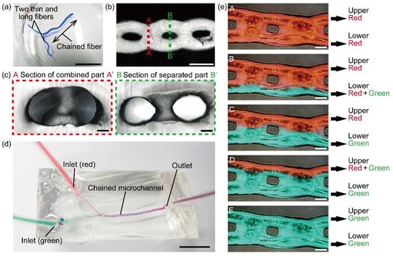 To fabricate chained PDMS microchannels, we used a modified method of hydrogel molding techniques [8]. To briefly describe the process, we first prepared an alginate microfiber with a structure where two long and thin fibers are connected to a chained fiber by controlling the flow rates of the sodium alginate solution in order to switch the flow regimes (i.e., from separated to chained). A thin PDMS substrate was formed in a 60-mm cell culture dish (Corning Inc., Corning, NY, USA) by heating a PDMS-curing agent mixture at a ratio of 10 to 1 (w/w) on the dish bottom for 90 min at 75 °C. Next, the PDMS-curing agent mixture was poured onto the thin PDMS substrate with the alginate microfiber on its surface and cured by leaving it in a vacuum desiccator overnight at room temperature (Figure 3a). The PDMS structure with the alginate microfiber was removed from the dish and was punched with a biopsy punch (tip diameter 1.5 mm, Kai Industries Co., Ltd., Gifu, Japan) at the ends of the embedded microfiber to form one-side-open holes used as inlets and an outlet of a microchannel. To form inlets and an outlet without leakage, we inserted ETFE tubes in the holes and sealed the gap between the holes and tubes by forming a PDMS cover on the PDMS structure (Figure 3b). To form microchannels, we washed out the embedded microfiber by introducing 500-mM sodium citrate solution in the PDMS substrate through the inlets (Figure 3c). One of the fabricated PDMS microchannels (Figure 3d,e) was sliced into cross-sectional thin layers using disposable microtome knives (S35, FEATHER Safety Razor Co., Ltd., Osaka, Japan) in order to observe the cross sections. To demonstrate a microfluidic operation in the microchannel, 5% (v/v) red and green ink, which were loaded in 1-mL gastight syringes (Model 1001, Hamilton Co., Reno, NV, USA), were introduced using a syringe pump.