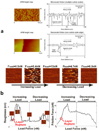 - Latorre, C.; Bhushan, B. Investigation of scale effects and directionality dependence on friction and adhesion of human hair using AFM and macroscale friction test apparatus. Ultramicroscopy 2006, 106, 720–734. [Google Scholar] [CrossRef] [PubMed]