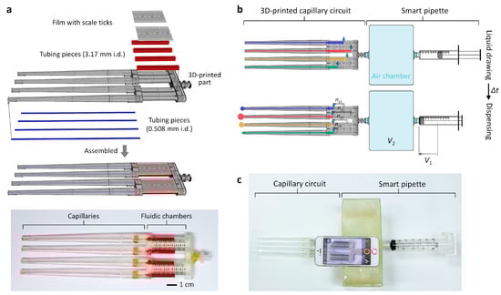 The 3D-CCs were fabricated by assembling a 3D-printed housing and cut tubing pieces to be used as the capillaries and fluidic chambers of the 3D-CCs (Figure 1). The 3D-printed parts were fabricated using a stereolithography-based 3D printer (DWS Systems, Thiene, Italy). The details of fabrication using stereolithography can be found in previous literature [24,25]. Tygon® tubings, with an inner diameter of 0.508 and 3.17 mm (Cole-Parmer, Vernon Hills, IL, USA), were cut into pieces to serve as the capillaries and fluidic chambers of the 3D-CCs, respectively. The air chamber, with an inner volume of 1.27 L, was fabricated using a 3D printer. Luer-Lock fittings were attached to the ends of the chamber for reversible and airtight interconnection between a 3D-CC and a syringe (Figure 1c). A film mask with scale ticks was fabricated, cut into pieces, and attached to the assembled 3D-CC for volume indication (Figure 1).