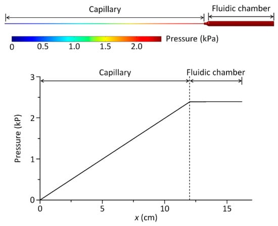 Computational fluid dynamics simulation showing the pressure profile along the fluidic channel of the 3D-CC for multiplexed analysis at µ = 11.0 cP and P = 2.4 kPa. Compared to the capillary, the drop in pressure along the fluidic chamber is negligible.