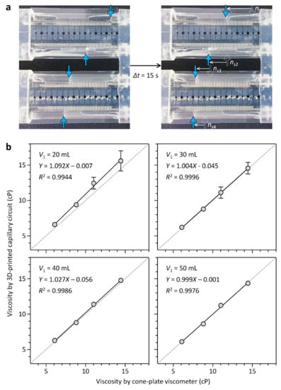 Multiplexed analysis of Newtonian fluids using the 3D-CC, having four identical fluidic channels. (a) Glycerol-water mixtures with different viscosities were analyzed using the 3D-CC platform at V1 = 30 mL. Their viscosities were 6.1, 8.8, 11.0, and 14.4 cP (from top to bottom) as determined by the cone-plate viscometer. The blue arrows indicate meniscuses; (b) effect of V1 on viscosity measurement. Solid lines denote linear regressions, while dotted lines represent a unity slope. Error bars: s.d. (n = 3).