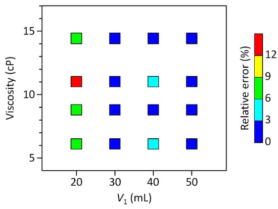 Relative errors of the 3D CC-based viscosity measurement results in Figure 3b as a function of V1 and the absolute viscosities measured using the cone-plate viscometer. Optimal operation conditions for accurate viscosity measurement can be determined from the color map for further experiments.