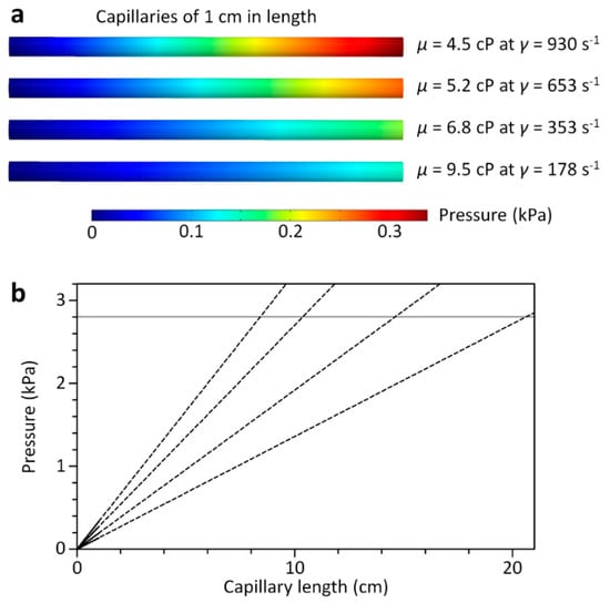 Computational fluid dynamics simulation for determining the capillary lengths of the 3D-CC for analysis of the xanthan gum solution under multiple shear-rate conditions. (a) Simulated pressure profiles along the capillaries (0.508 mm in inner diameter) at different µ and γ to calculate the pressure drop per unit length at each condition. The viscosities were obtained using the microfluidic comparator and varied according to the corresponding γ; (b) the different capillary lengths were determined from the relationship between ∆P and L, the Hagen-Poiseuille law, at the different µ and γ conditions. The dotted lines denote the relationships between ∆P and L for µ = 4.5, 5.2, 6.8, and 9.5 cP from left to right. At ∆P = 2.8 kPa, the capillary lengths were, respectively, determined as 8.4, 10.4, 14.6, and 20.6 cm that can, subsequently, generate the corresponding γ conditions for the 3D-CC.