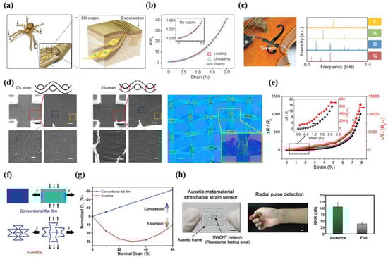 (a) Image of the special spider organ for detecting external stimuli (left) and the magnified image of the organ (right); (b) the relative output resistance change versus strain, including theoretical data; the inset shows the results of no cracks; (c) image of crack sensor onto violin for detection of sound wave (left). The intensity versus frequency, when Elgar’s ‘Salut d’Amour’ was played (right) (reprinted with permission for Figure 3a–c, from Ref. [20] Copyright 2014 Springer Nature); (d) SEM image shows the stretched graphene woven fabric (GWFs) depending on the strain (left). Optical image of the GWF on Si/SiO2 substrate (right); (e) data showing the relative output resistance under different strain levels. (Reprinted with permission for Figure 3d,e from Ref. [22] Copyright 2015 American Chemical Society); (f) finite element modeling (FEM) simulation data including conventional flat film structure and auxetic metamaterial structure under 15% tensile strain; (g) the normalized displacement at the transverse direction under different levels of longitudinal tensile strain; (h) auxetic strain sensor and human wrist with sensor (left). The signal-to-noise ratio data in case of auxetics and flat sensors (right) (Reprinted with permission for Figure 3f–h from Ref. [40] Copyright 2018 John Wiley and Sons).